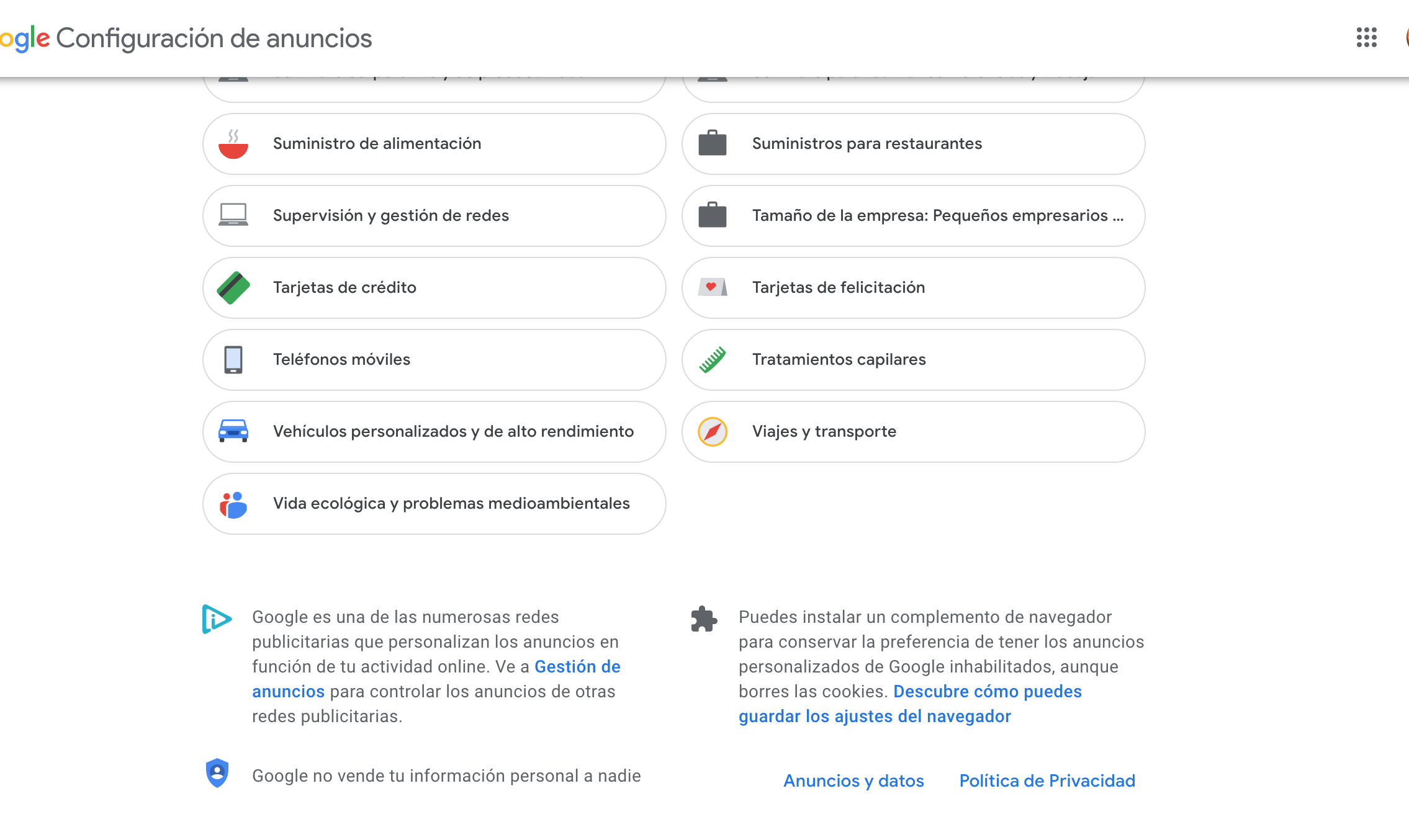 Al final de la página, está la opción de ir a la Gestión de Anuncios, y a través de una página de la DAA (Asociación de Anunciantes Digitales) optar por no recibir más información basada en tu navegación anterior.