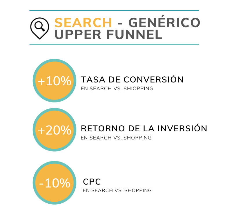 Mientras Search es perfecto para el Upper Funnel, Shopping es el canal adecuado para el Low Funnel. El uno sin el otro no se entiende. Una buena estrategia de Marketing debería contemplar ambas plataformas siempre.