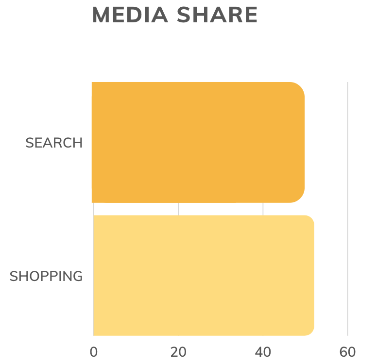 En primer lugar, los resultados del estudio demuestran que, sorprendentemente, el porcentaje de media-share que tiene Search comparado con Shopping es muy parecido.