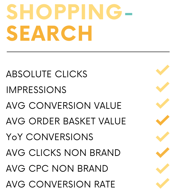 Las dos métricas en las que Search supera a Shopping son Avg. Order Basket Value y curiosamente, ya que el cliente que usa Shopping habitualmente sabe lo que quiere, Avg. Clicks Non Brand. En todas las demás, los resultados de Shopping superan a los de Search en un 30% aproximadamente.